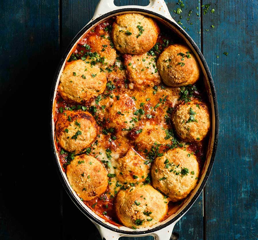 Try a modern take on stew and dumplings with Italian classic tomato alla arrabbiata and parmesan dumplings. Simple and oh so comforting.