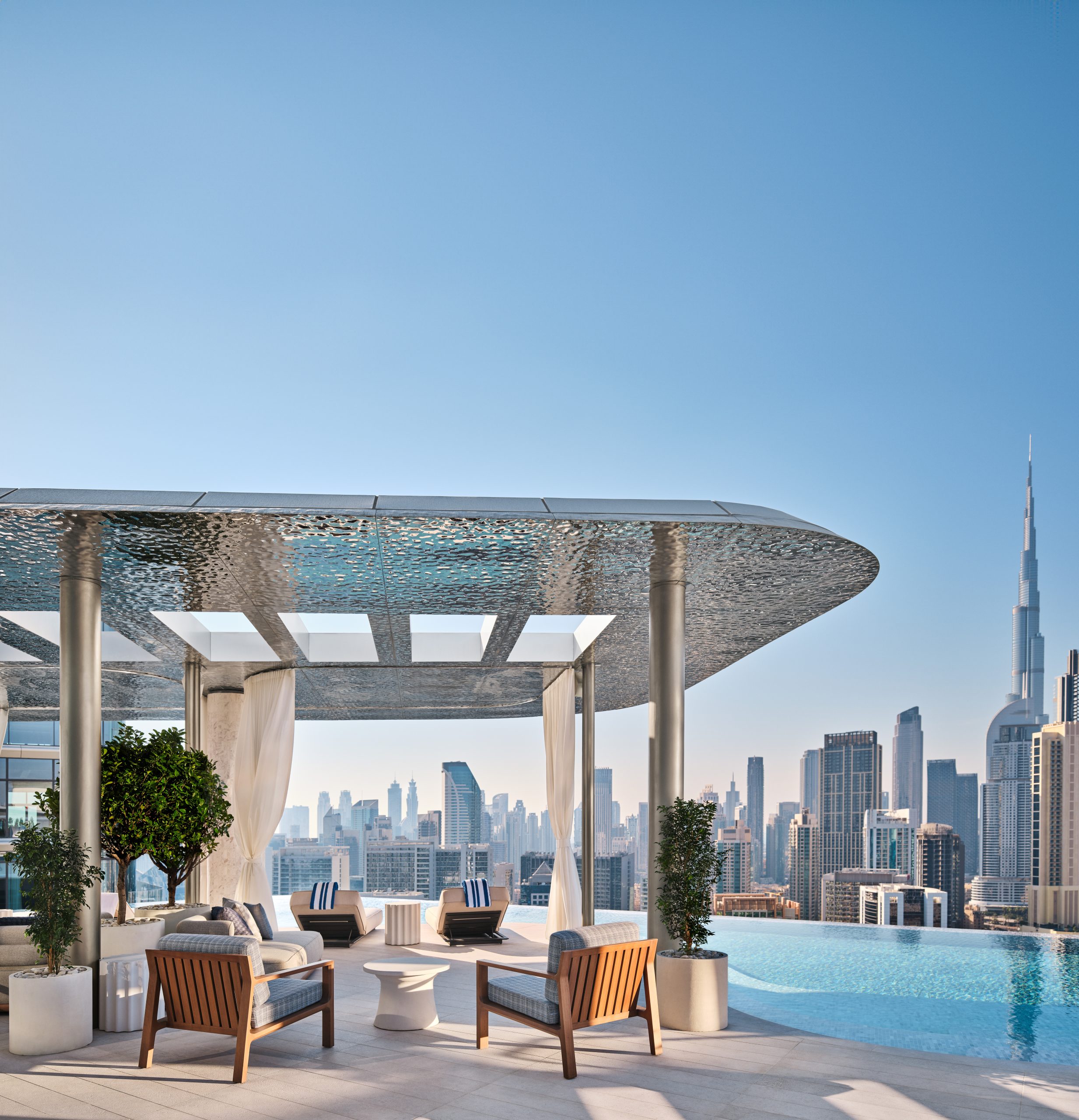 High Society, nestled atop The Lana, the rooftop lounge at The One hotel, promises a breathtaking 180° vista of Dubai’s skyline, including iconic landmarks like Downtown Dubai and the majestic Burj Khalifa, as well as the tranquil Dubai Creek. This vibrant concept transitions from a serene daytime retreat for hotel guests to a spirited lounge after sunset, offering unparalleled city views and an enticing food and beverage menu curated to live up to its name. Chef-curated ‘finger food’ sharing plates featuring high-quality ingredients like zucchini flowers, eggplant, langoustines, and raw fish complement the immersive experience.
