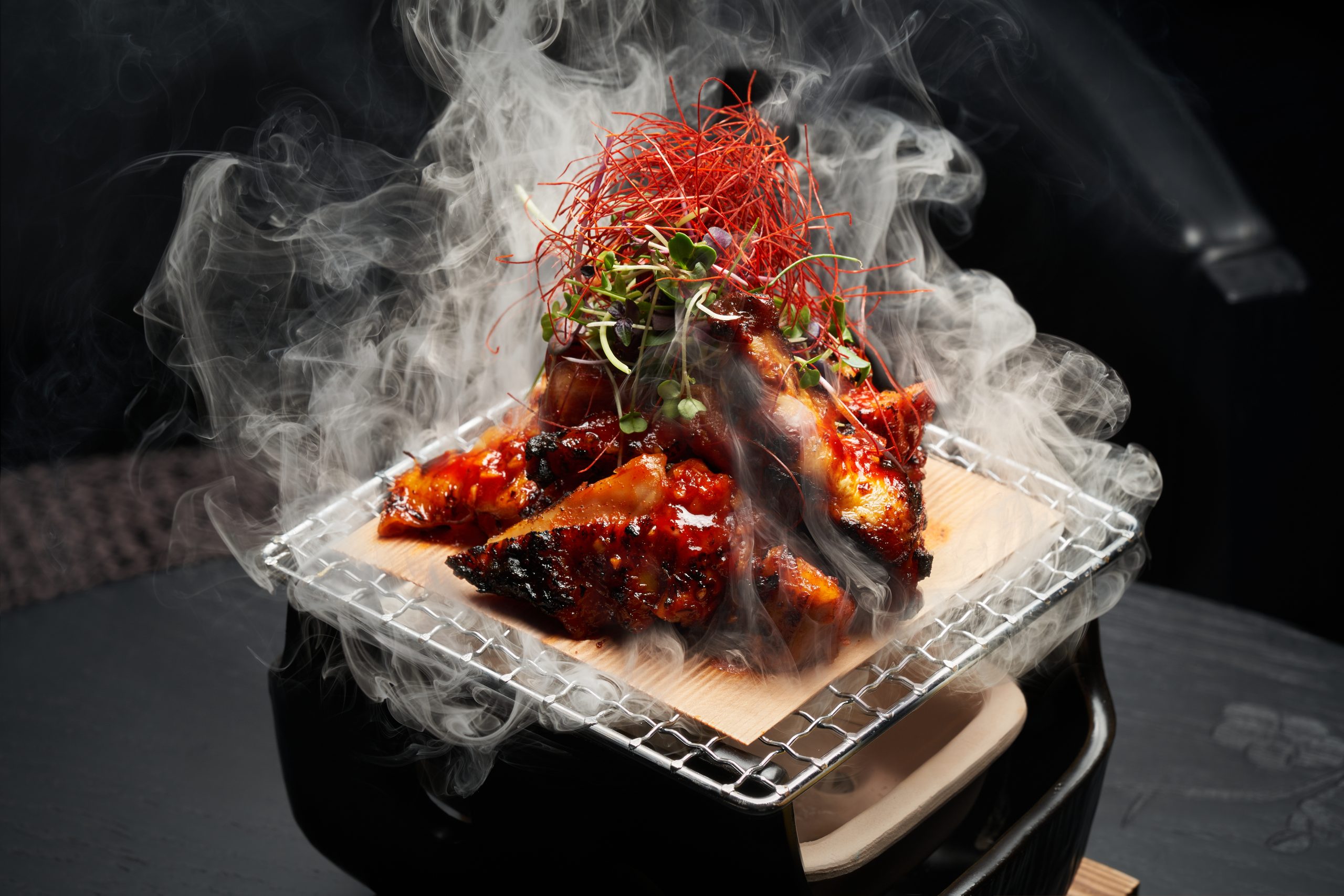 The interiors pay homage to Japanese culture and aesthetics, from traditional Yakisugi decorative wooden panels, signature stone walls and bespoke Japanese-inspired artworks to eight striking 3D-printed Samurai soldiers, every aspect serves as a nod to Japanese heritage. One of the standout features of OKKU is its breathtaking space, where the main restaurant takes centre stage with a remarkable 20-meter Sushi Bar & Robata Grill where we took our seats to enjoy the bustling scene. If you’re looking for a more relaxed setting, the OKKU lounge beckons with its plush lounge seating, accompanied by a glamorous central bar.