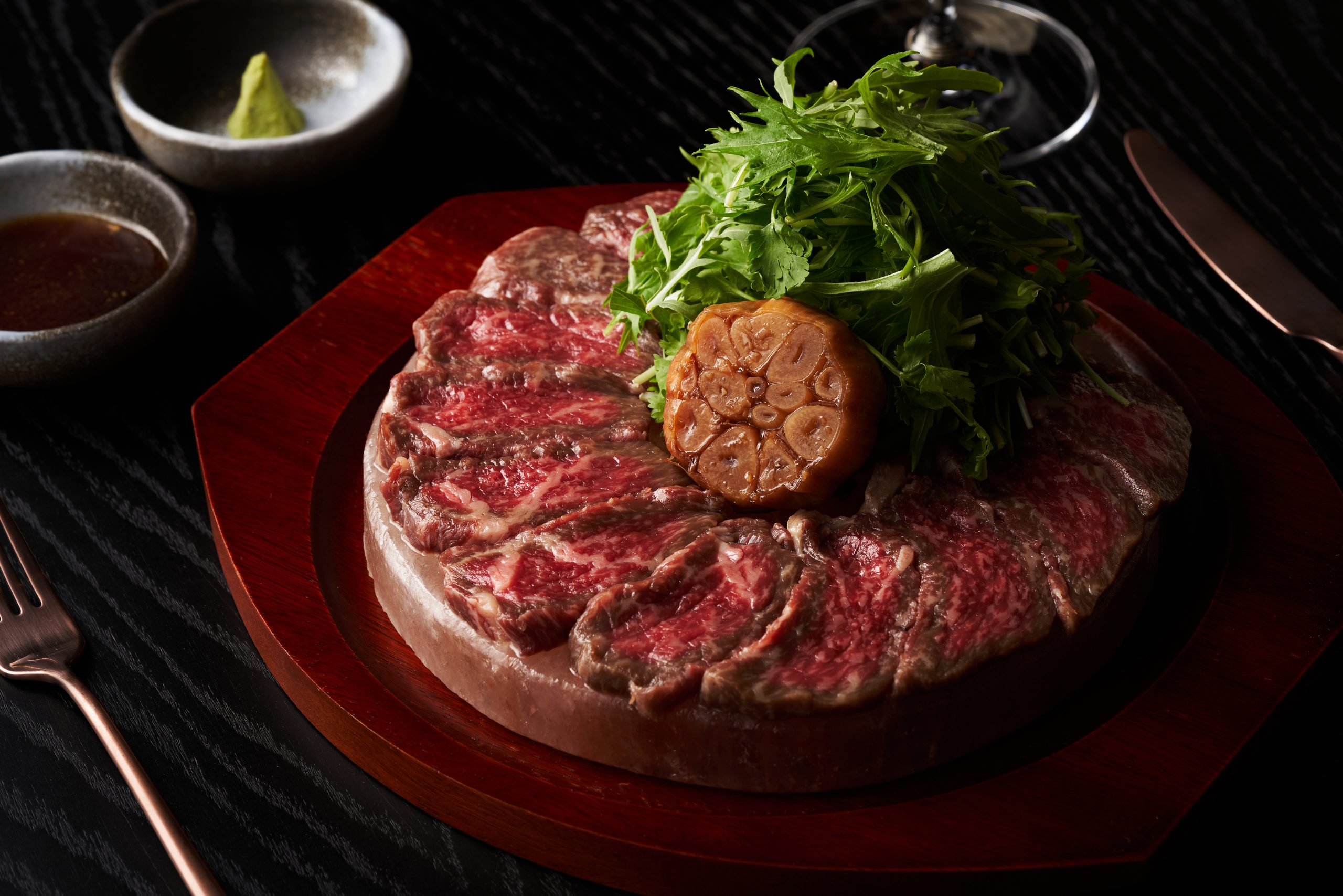 For the main course, we delved into the Wagyu Himalayan shioyaki (200GR), a culinary masterpiece featuring Wagyu 9+ beef cooked table-side on a sizzling Himalayan salt stone, served with rocket, spring onion, garlic scape, and an array of delectable condiments, including chilli garlic and butter. Equally enticing was the Chilli-miso baby chicken yakiniku, impeccably grilled on the robata.